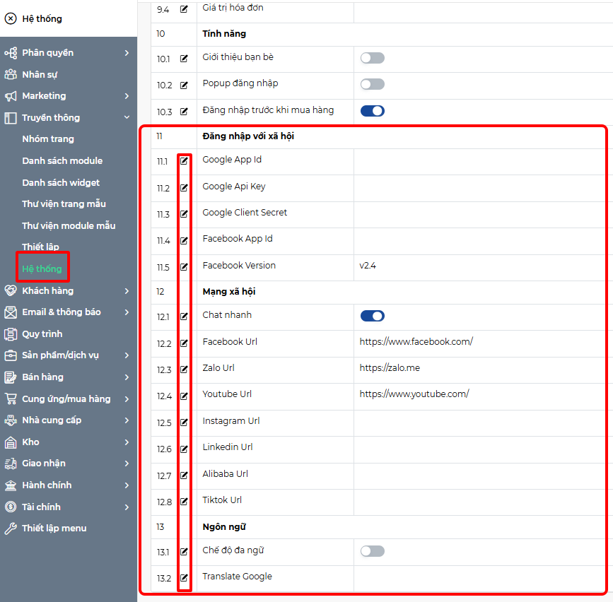 Bằng cách ấn vào nút sửa ngay bên cạnh tên thuộc tính ta có thể đổi giá trị thuộc tính tùy chọn. Thuộc tính trong danh mục đăng nhập bằng tài khoản mạng xã hội, và ngôn ngữ bao gồm:
