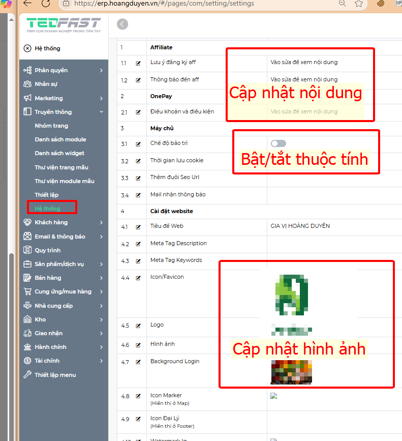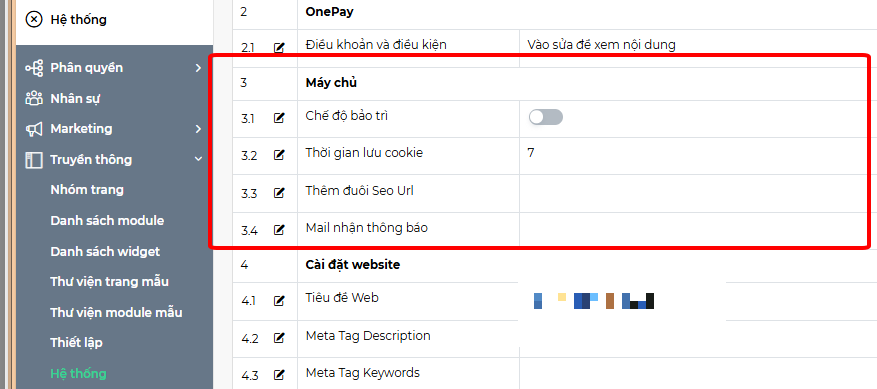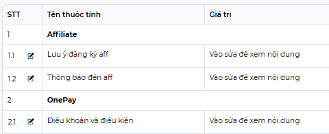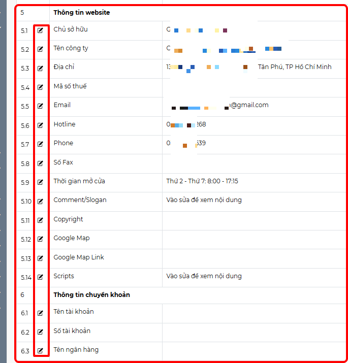 Bằng cách ấn vào nút sửa ngay bên cạnh tên thuộc tính ta có thể đổi giá trị thuộc tính tùy chọn. Thuộc tính trong danh mục thông tin website và thông tin chuyển khoản bao gồm: