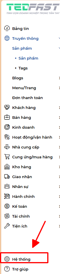 Bước 1. Để truy cập vào " Truyền thông hệ thống" ta cần vào menu hệ thống ngoài giao diện chính của phần mềm ERP. Và ấn vào nút "Hệ thống" tại góc trái dưới như hình.