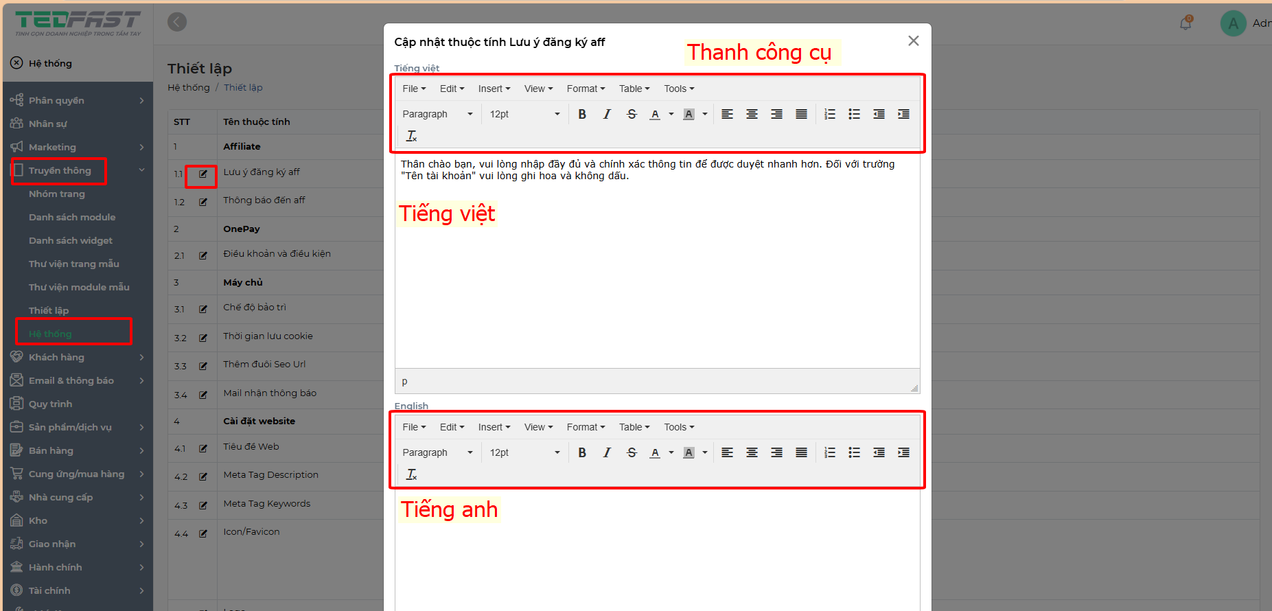 Bước 3. Truy cập vào menu thiết lập để thực hiện các thay đổi chỉnh sửa hệ thống của Menu Truyền Thông. Bằng cách ấn vào nút sửa ngay bên cạnh tên thuộc tính ta có thể đổi giá trị thuộc tính tùy chọn. Tại đây có Thanh công cụ để tùy chỉnh dữ liệu, và 2 khung nhập cho 2 ngôn ngữ khác nhau (Tiếng Việt & Tiếng anh). Sau khi