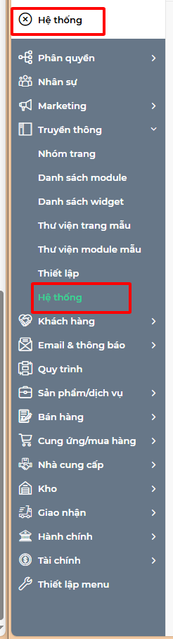 Bước 2: Sau khi click vào nút "Hệ thống", Menu hệ thống xuất hiện như sau. Click vào menu "Truyền thông" để xổ ra các tính năng hệ thống của phân hệ Truyền thông.