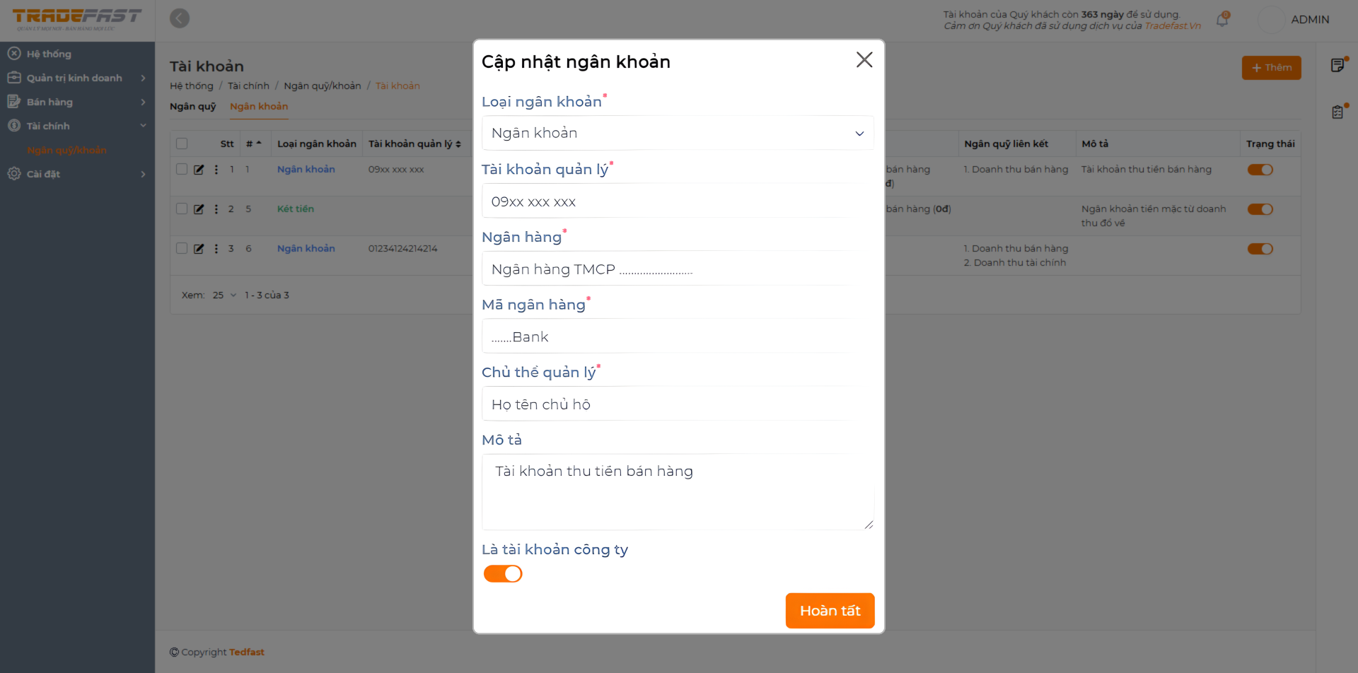 - Bước 3: Sau khi chọn Thêm hoặc Chỉnh sửa, hệ thống sẽ hiển thị Form Cập nhật ngân khoản.