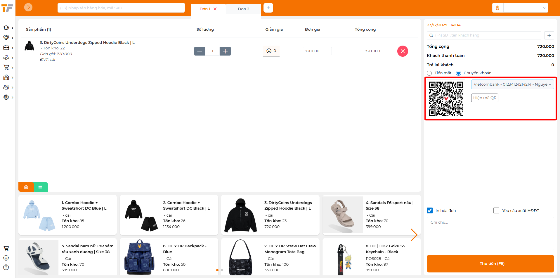 Sau khi lưu thông tin ngân khoản, mã QR thanh toán sẽ tự động hiển thị trên màn hình POS, giúp khách hàng quét mã và chuyển khoản nhanh chóng. Khách hàng có thể quét thử mã QR để kiểm tra xem đã chính xác hay chưa.