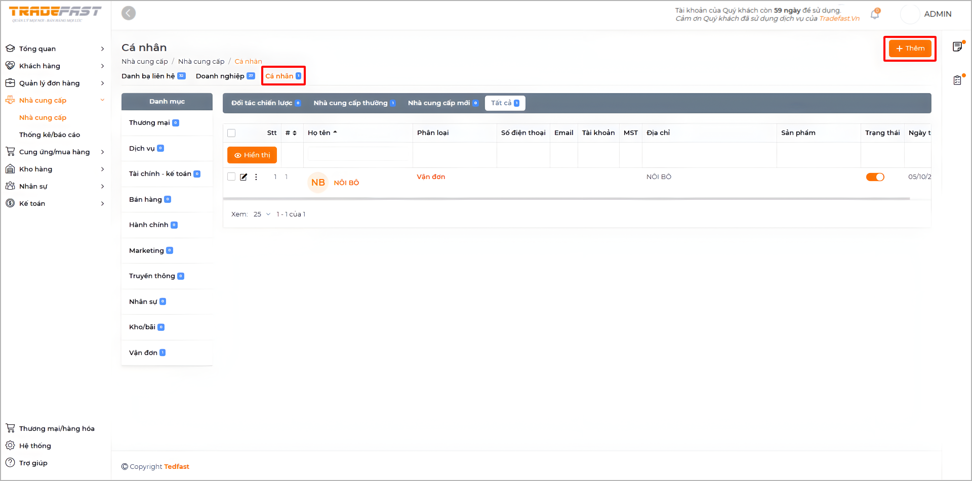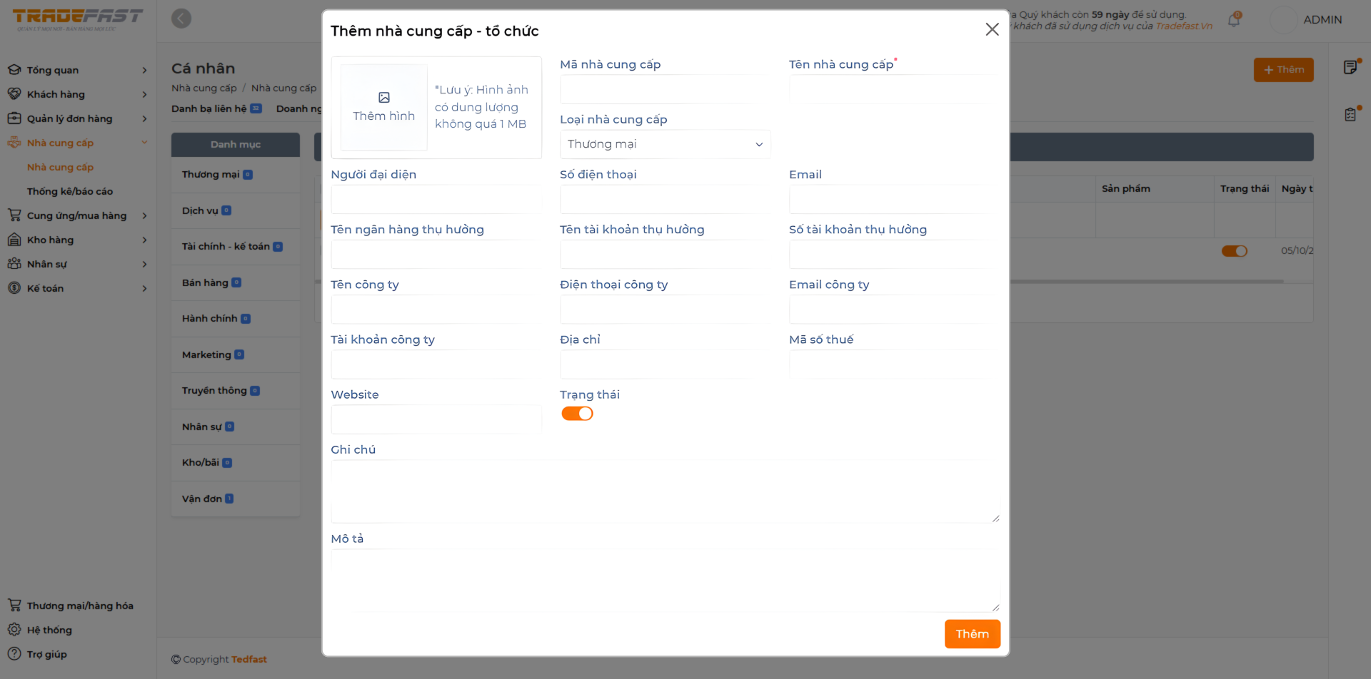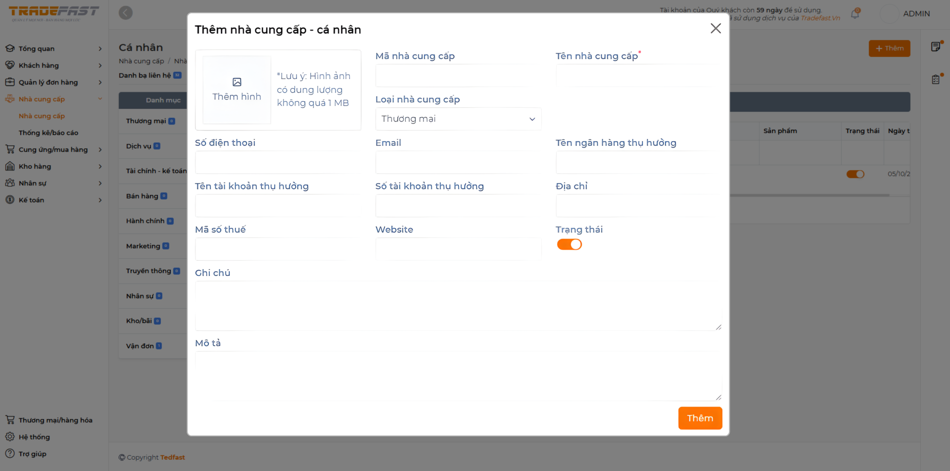 - Bước 2: Sau khi chọn Thêm, hệ thống sẽ hiển thị Form Thêm nhà cung cấp cá nhân