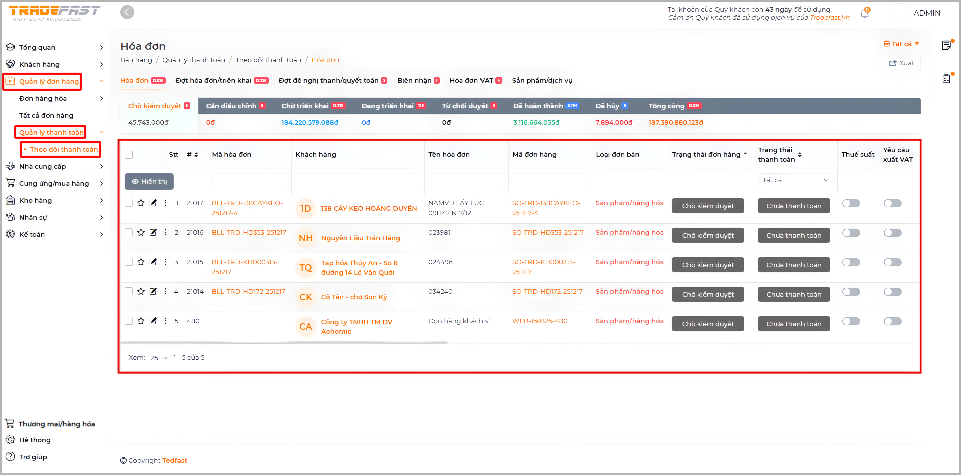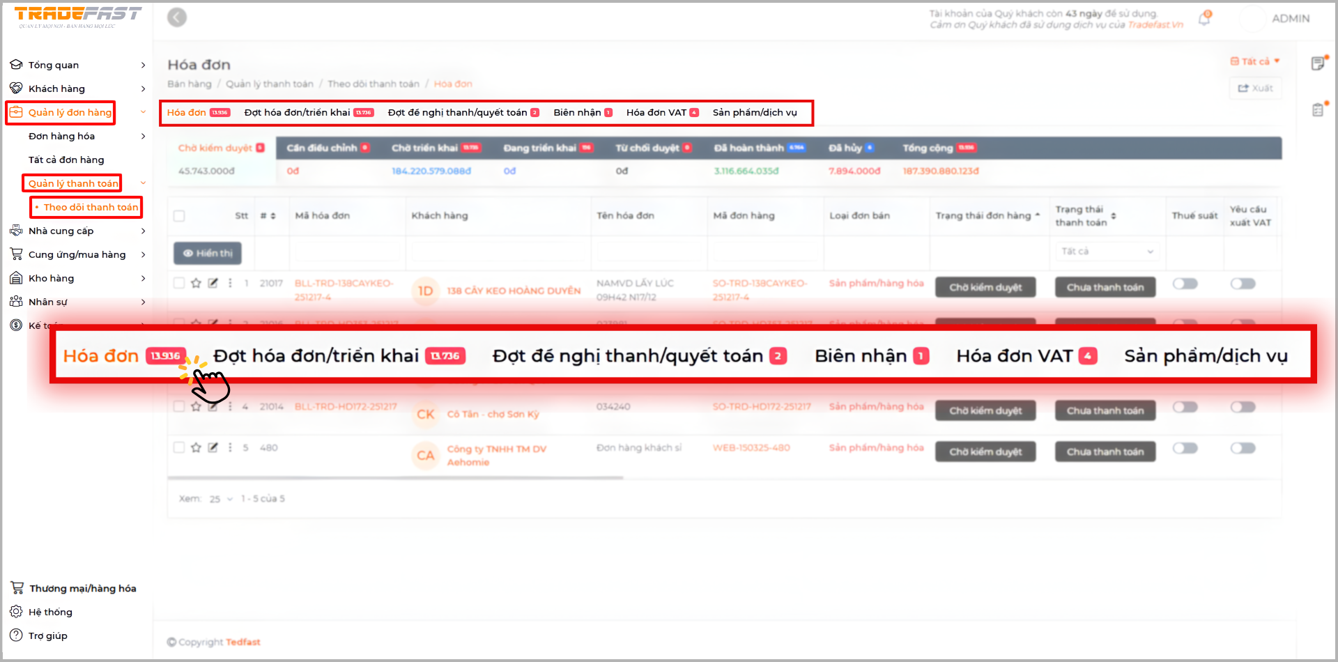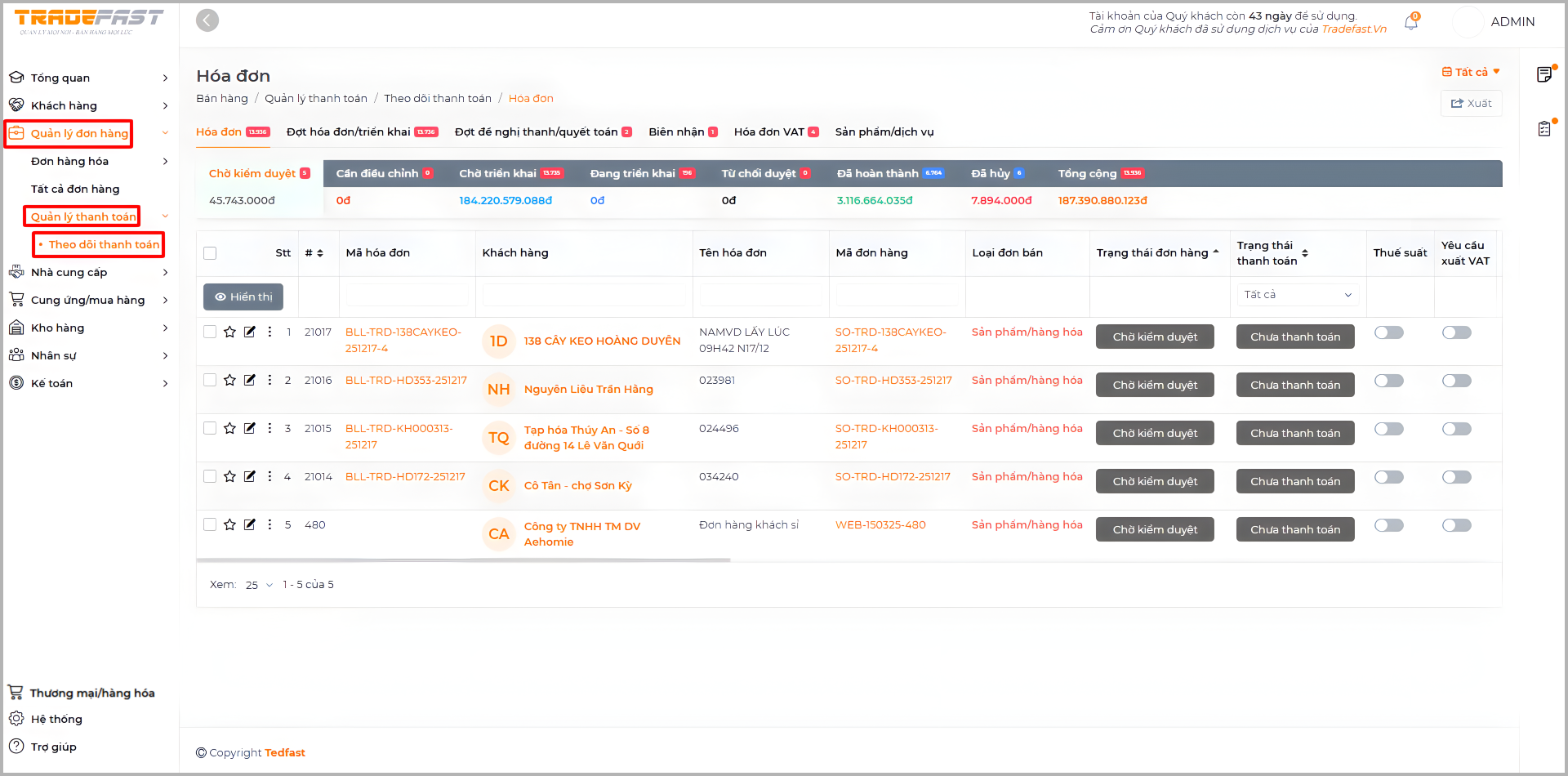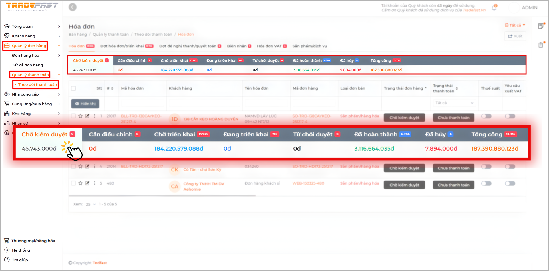 | Chờ triển khai | Hóa đơn đã duyệt, chờ xử lý |
