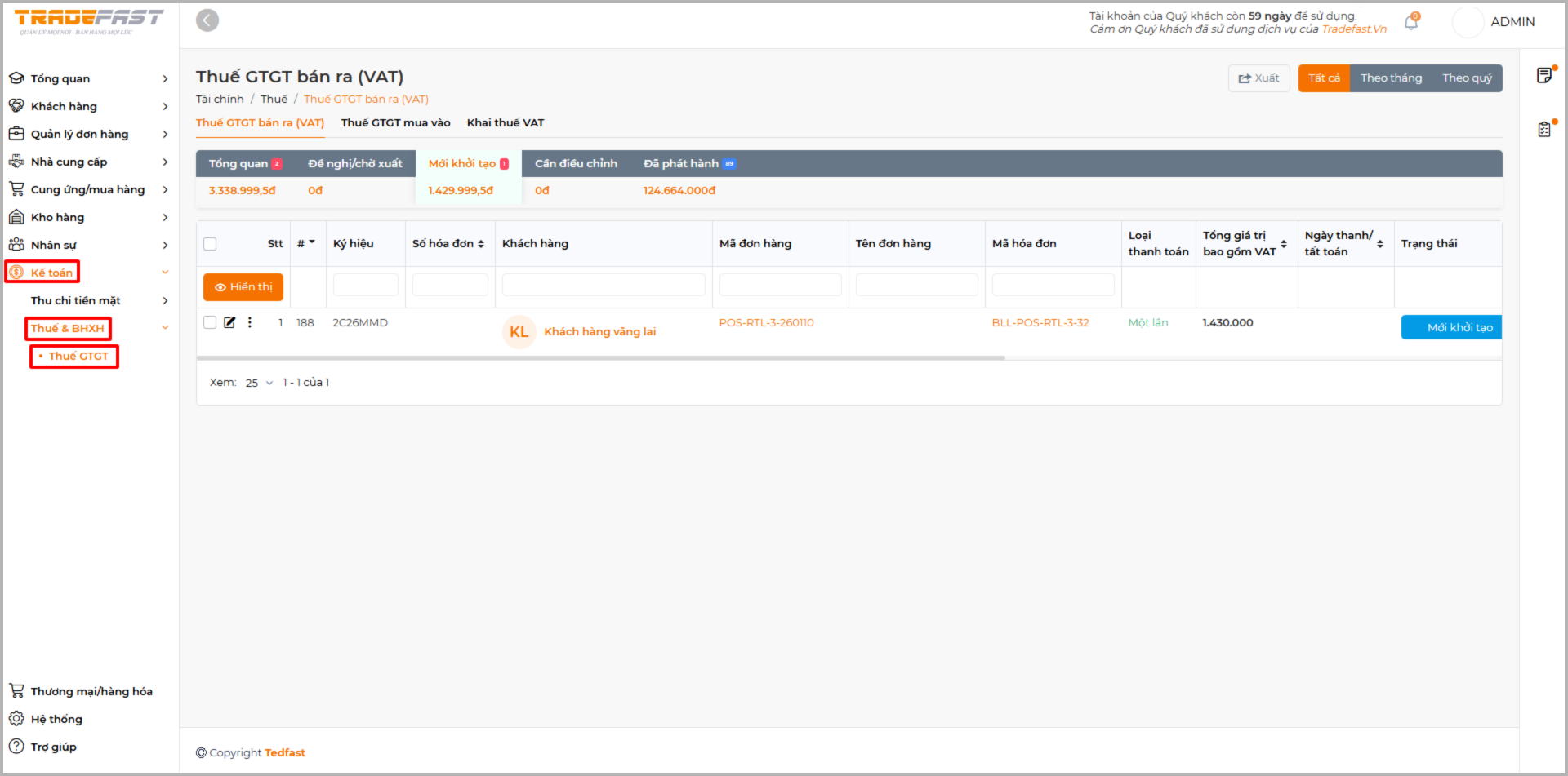 Truy cập chức năng ký hóa đơn. Vào menu: Kế toán → Thuế & BHXH → Thuế GTGT. Tại đây, hệ thống sẽ hiển thị danh sách các hóa đơn VAT đang chờ ký.