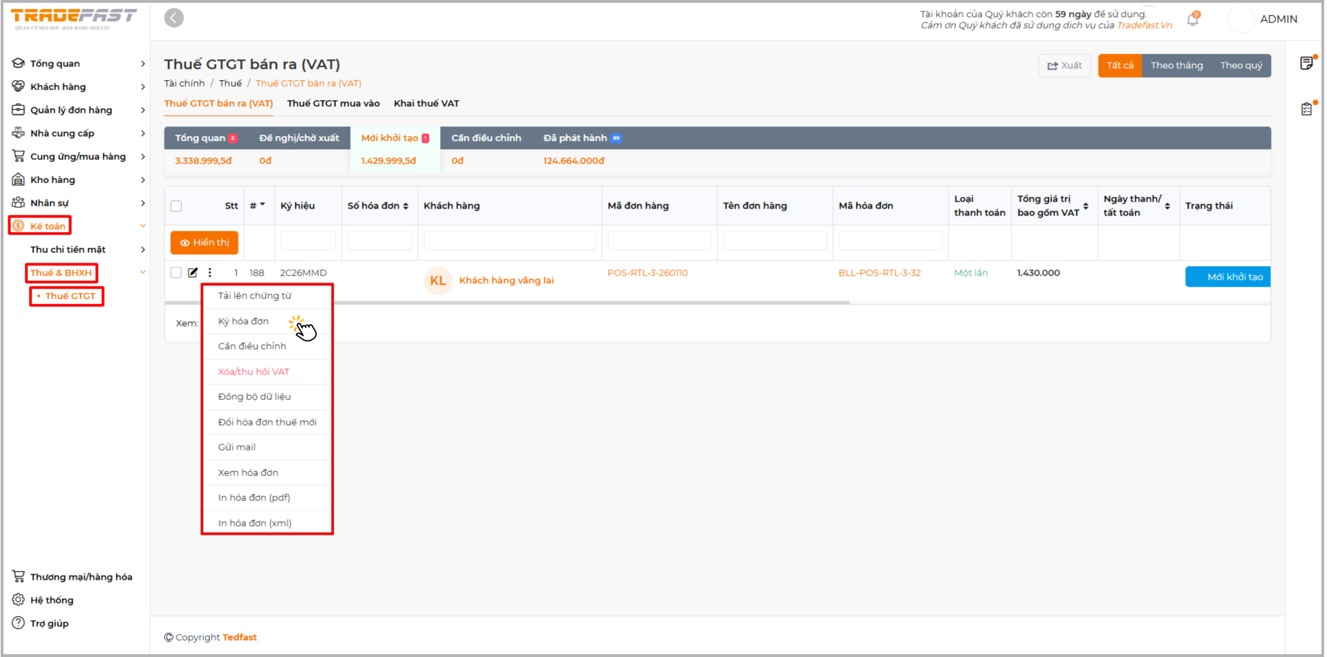 Chọn Ký hóa đơn để hoàn tất việc phát hành hóa đơn VAT