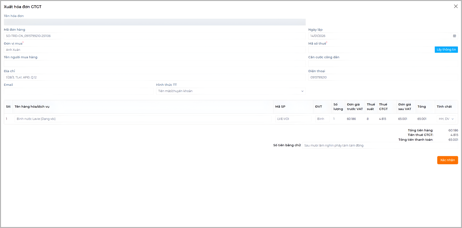 Sau khi kiểm tra xong, nhấn Xác nhận để tạo Hóa đơn nháp