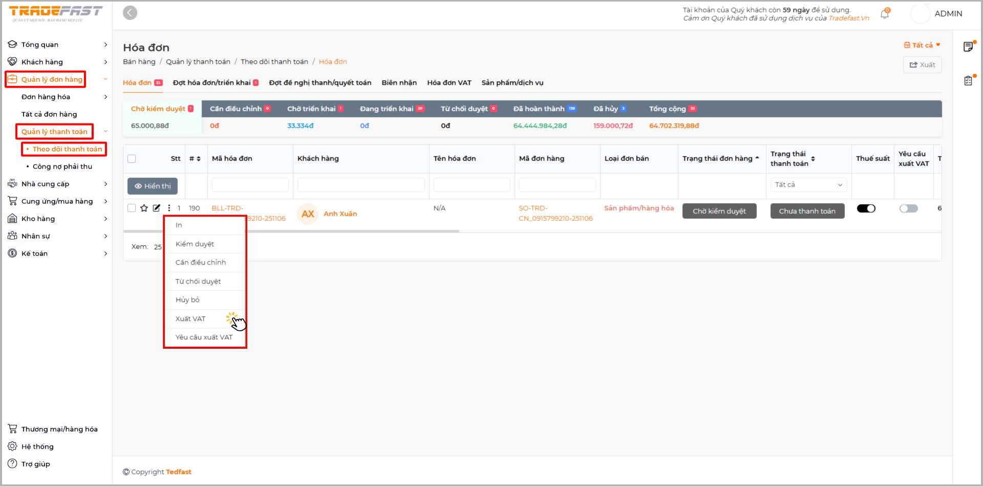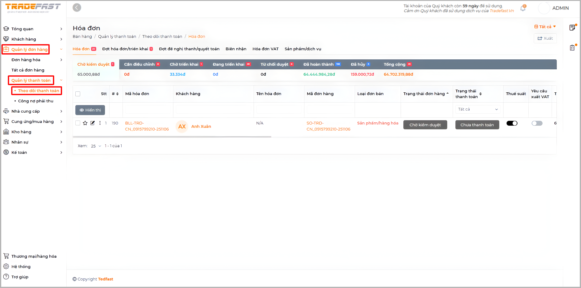 Vào Quản lý đơn hàng → Quản lý thanh toán → Theo dõi thanh toán